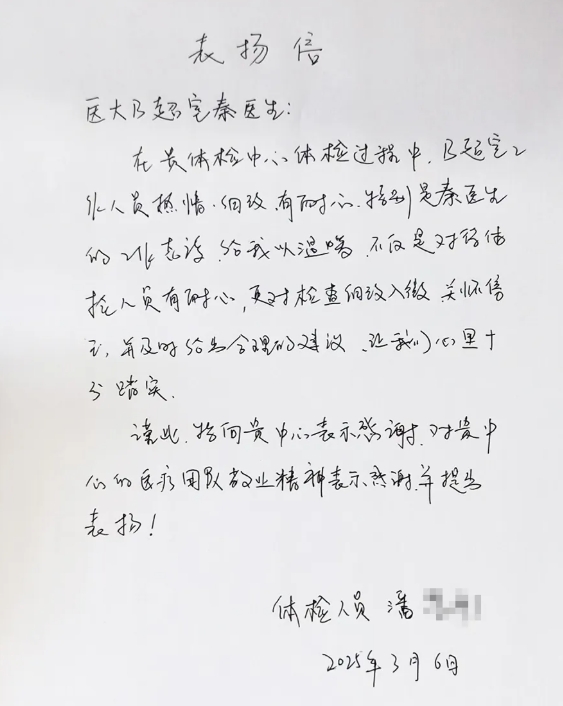 3月6日,北京医大中西医结合医院体检中心B超室秦景春医生收到了一封体检者潘女士手写的表扬信,信中字里行间饱含着对秦医生精湛医术和暖心服务的认可与感谢,这不仅是对我院体检中心医护工作的极大肯定,更是激励全体医护人员继续前行的动力源泉。